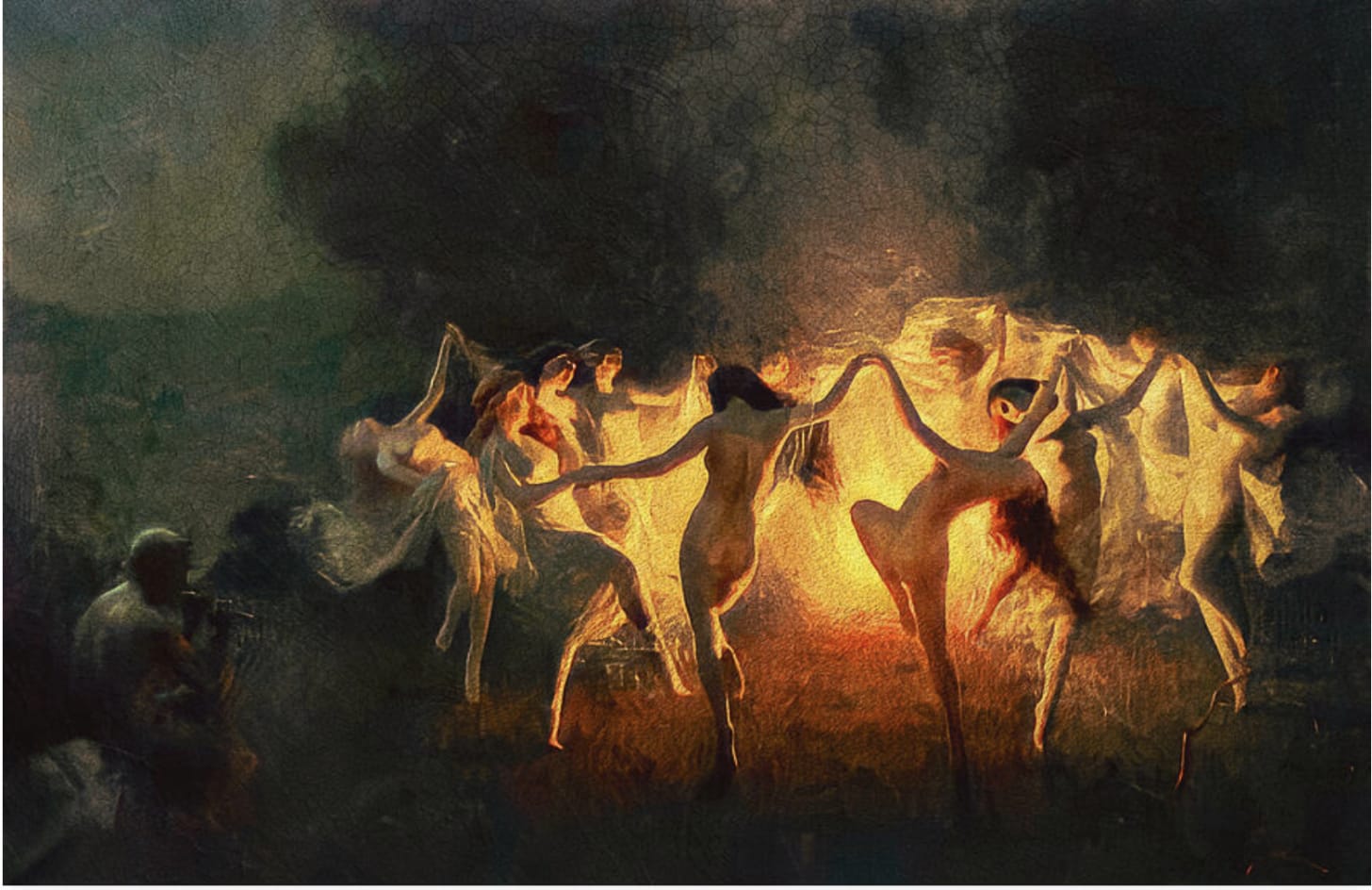 Slowly they regard one another, reaching delicately for one another’s hands as school girls at play. They have made a joyous ring around this posey and follow, skipping, laughing, crying, all the while clutching one another’s hands in sisterhood. I, contrarily, feel the flames inside me begin to move up. Up and out. A thick beam coursing out from beyond my teeth from who knows where, and shooting straight up towards the stars. I cannot tell if the droplets that fall are its embers or rain scurrying to snuff the flames. The beam courses through my body like a regurgitation, as if expelling exceptionally bad shrimp. The mothers and maidens are singing, chanting, now as the circle. The crones gleefully in step as- peculiar. As the pulsing begins to wane. The beam now shrinking as when a hose loses its source. My rigid body softens and I feel the grass kiss my knees, then my hips, then my face.